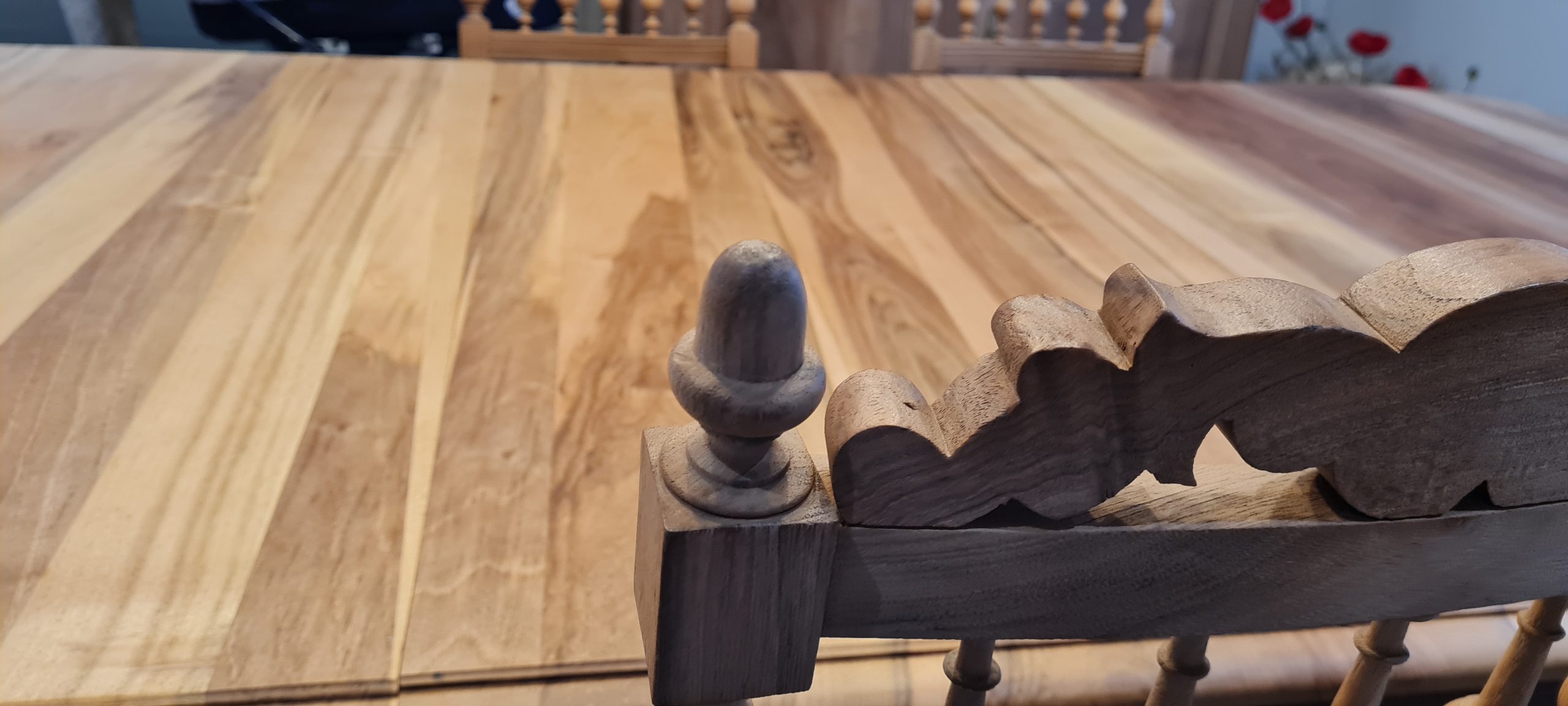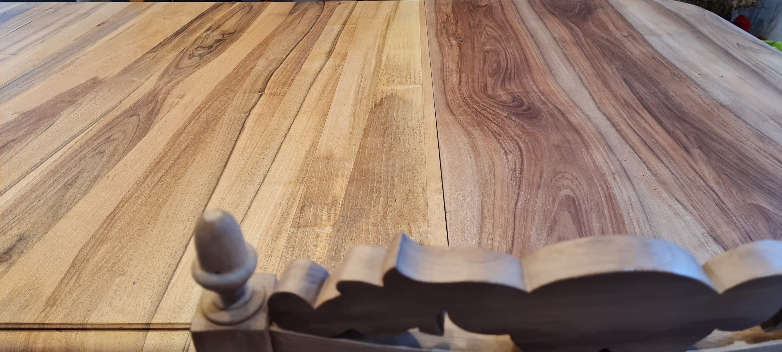 Le noyer a révélé son beau veinage et après préparation de la surface nous avons opté pour un vernis incolore mat pour chercher la modernité et gagner en discrétion.
