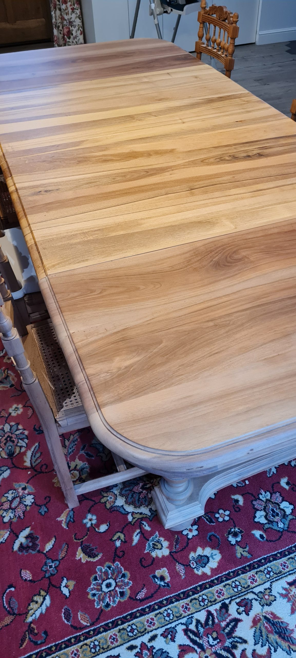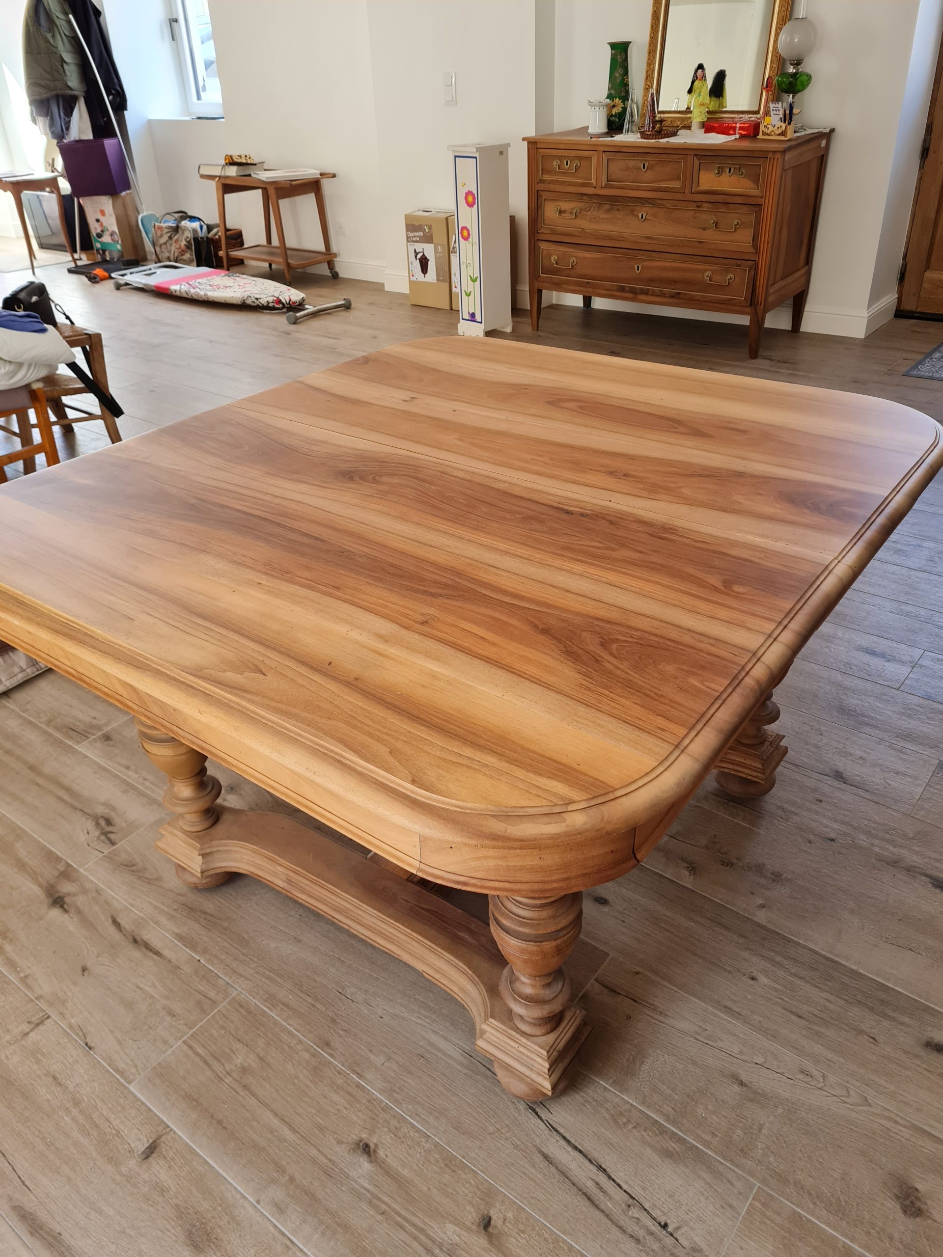 Pour les rallonges j’ai trouvé des plateaux de vieux de noyer dormant dans une grange depuis 20 ans. Après usinage et assemblage les plateaux se marient avec le plateau de table et nous garantissons ainsi nos valeurs d’éco-conception.